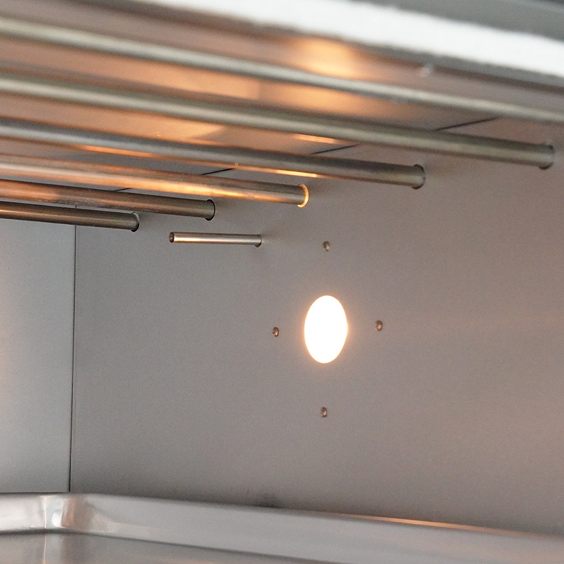 Thân vỏ lò HGD-20D được chế tạo chính từ chất liệu inox 304 cao cấp, không han gỉ, dày 1mm. Khoang lò bằng thép phản xạ nhiệt tốt, tản đều và bền bỉ ở nhiệt độ cao. Ở giữa là lớp bông thủy tinh cách nhiệt dày đặc, hạn chế tối đa tình trạng thoát nhiệt ra bên ngoài. Từ đó rút ngắn thời gian nướng nhanh hơn, tiết kiệm điện năng và đồng thời đảm bảo an toàn khi chạm vào thiết bị.