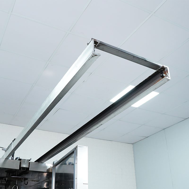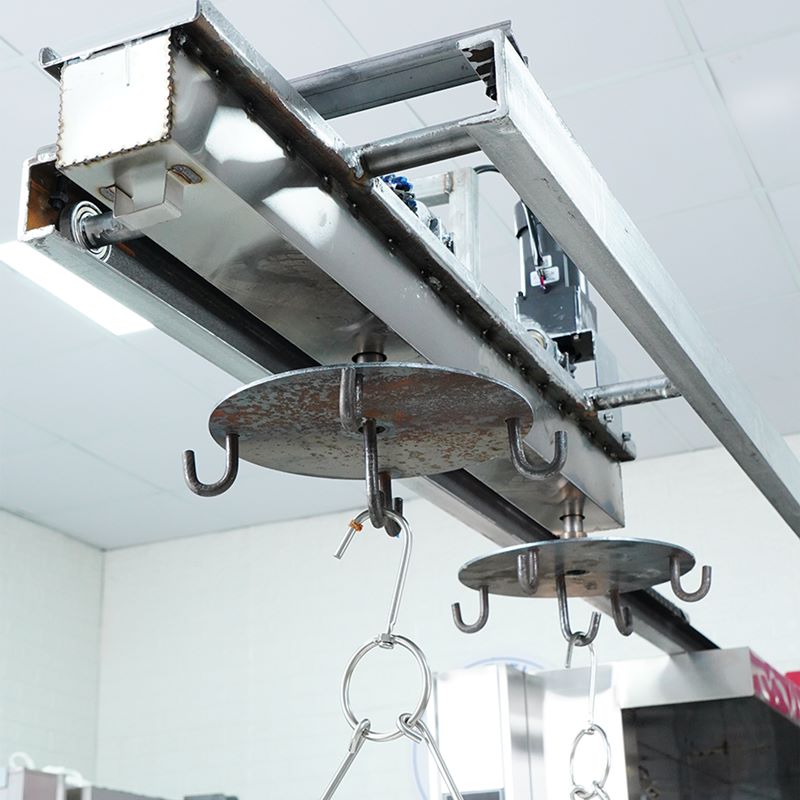 Lò quay heo bằng gas KN-1912-10 được trang bị hệ thống giá treo thiết kế thông minh, hỗ trợ tối đa cho người vận hành. Hệ thống này gồm thanh trượt, dây xích, trục treo gắn con lăn, cùng hai lồng treo lợn chịu lực tốt và chắc chắn. Khi cần di chuyển hoặc đưa heo ra vào lò, người dùng chỉ cần nhẹ nhàng kéo hoặc đẩy lồng bằng thanh móc, không cần đứng sát cửa lò và không sợ bị nhiệt phả trực tiếp vào người.