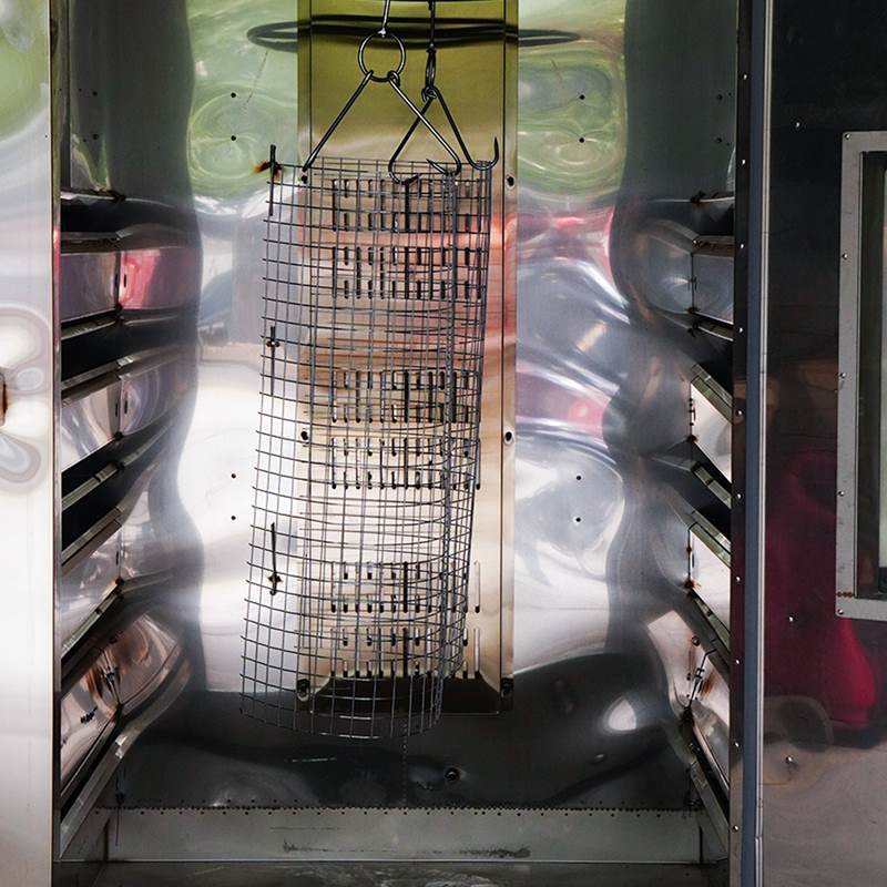 Bên cạnh đó, lò sử dụng phương thức nướng treo thẳng kết hợp móc treo độc lập xoay 360°, giúp heo quay đều quanh trục trong suốt quá trình nướng. Thiết kế này đảm bảo mọi mặt heo đều nhận đủ nhiệt, hạn chế tối đa tình trạng chỗ chín quá, chỗ chưa chín hay cháy cục bộ. Đồng thời, phương thức treo thẳng còn giúp mỡ thừa tự động chảy xuống đáy lò, không thấm ngược trở lại vào thịt, giữ thành phẩm ngon, vàng giòn và mềm ngọt tự nhiên.