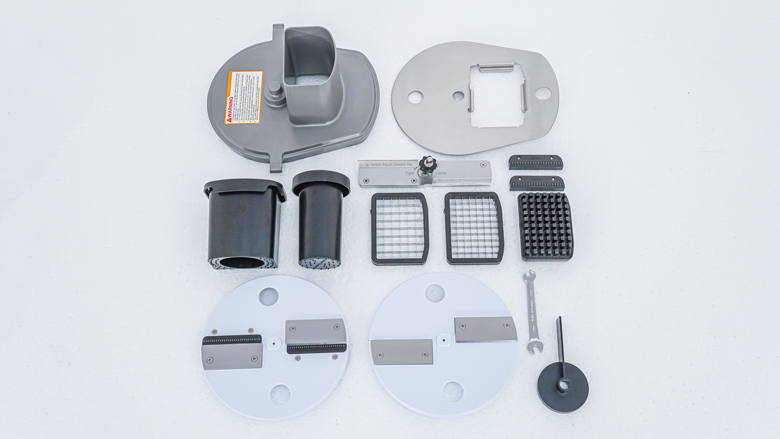 Máy được trang bị nhiều bộ dao phù hợp cho nhu cầu thái, xắt, băm nhỏ với nhiều hình dạng: lát, sợi, hạt lựu,… Cụ thể: