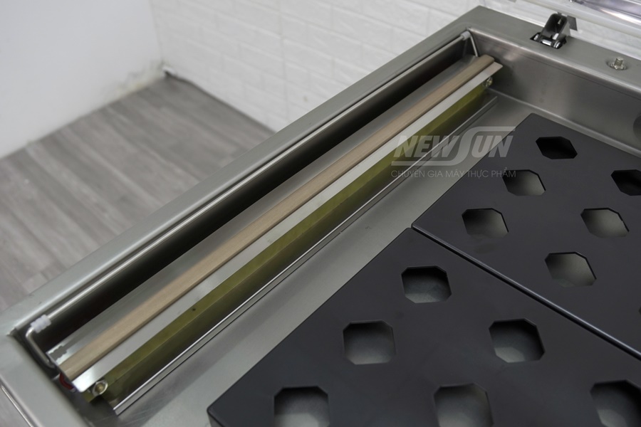 Phần nắp máy được gia cố bằng thanh nẹp inox chắc chắn, giúp giảm rung, tăng độ bền. Hai thanh silicon cố định đảm bảo miệng túi luôn nằm đúng vị trí, cho đường hàn phẳng và đẹp.