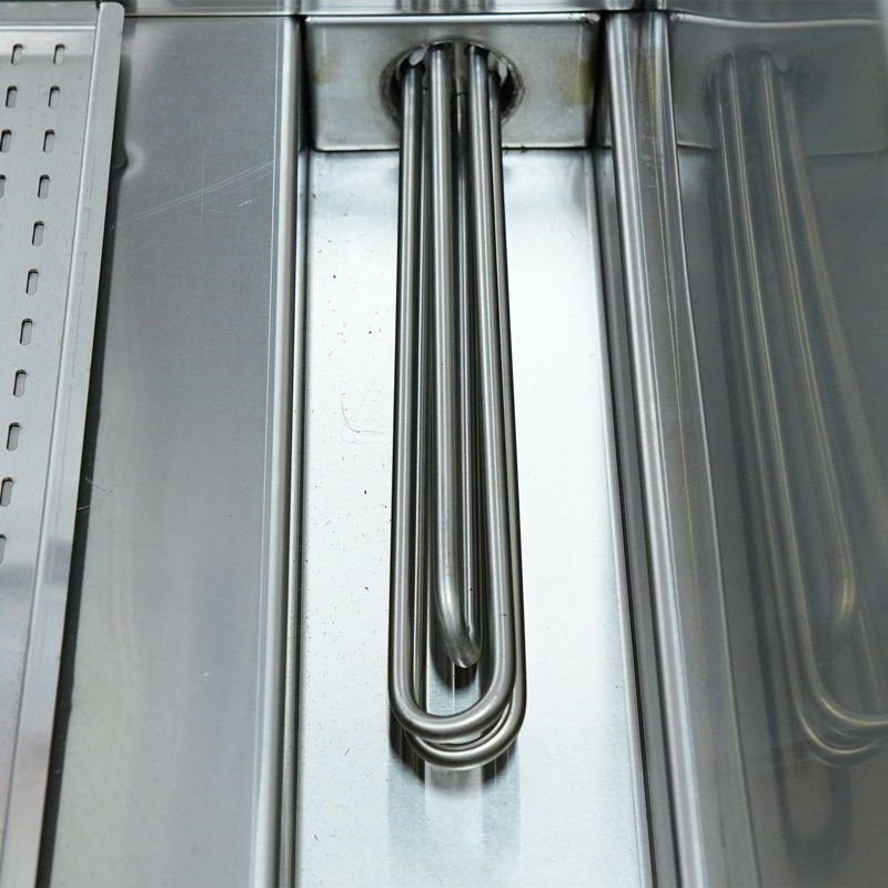 – Thanh nhiệt chữ U kép công suất 3kW giúp nước nóng nhanh, hòa tan dầu mỡ mà không cần dùng nhiều hóa chất tẩy rửa. Hiệu quả làm sạch lên đến 99%, ngay cả các khe kẽ nhỏ mà cách rửa thông thường khó tiếp cận, đồng thời đảm bảo an toàn cho bề mặt đồ sứ, thủy tinh, inox,…