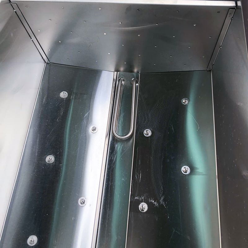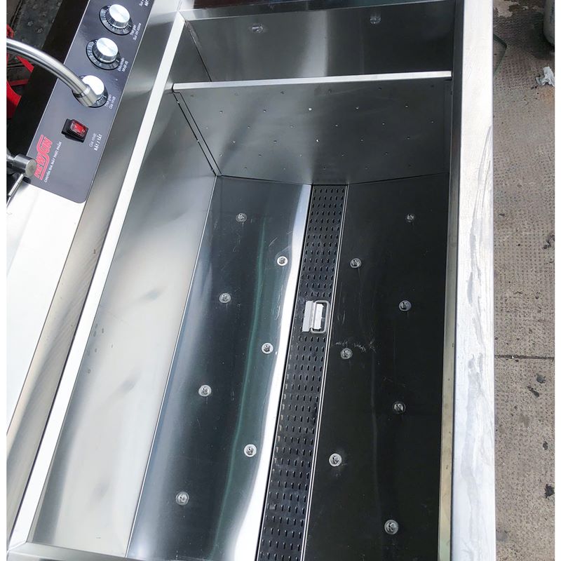- Trang bị van xả lớn, giúp thoát nước nhanh chóng và tiết kiệm thời gian giữa các mẻ rửa. Bồn inox liền khối hạn chế bám cặn, giúp quá trình vệ sinh sau mỗi ca làm việc trở nên nhẹ nhàng, góp phần duy trì tuổi thọ thiết bị và đảm bảo hiệu quả vận hành lâu dài.