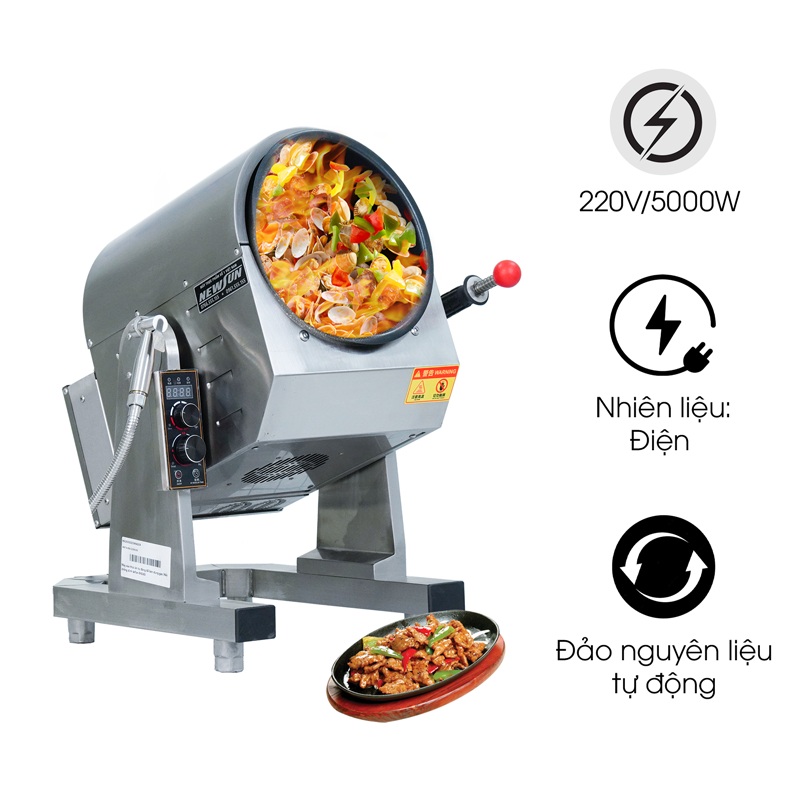 Điểm vượt trội của chiếc máy này nằm ở cơ chế xoay tròn 360 độ của lòng nồi. Thức ăn sẽ được nấu chín nhanh chóng mà vẫn ngấm đều gia vị vào thực phẩm mà đầu bếp không cần dùng tay hất, đảo thủ công như khi dùng chảo và bếp nấu truyền thống.