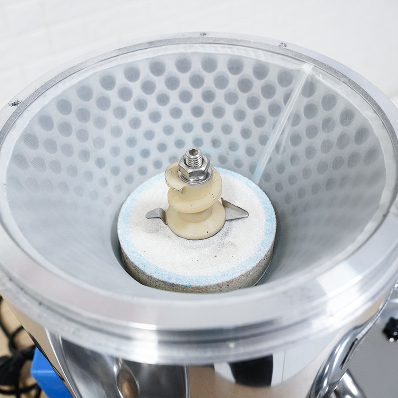 Máy sử dụng đá nghiền trắng có độ cứng cao, tạo lực ép ổn định trong quá trình xay, giúp đậu được nghiền mịn hơn.
