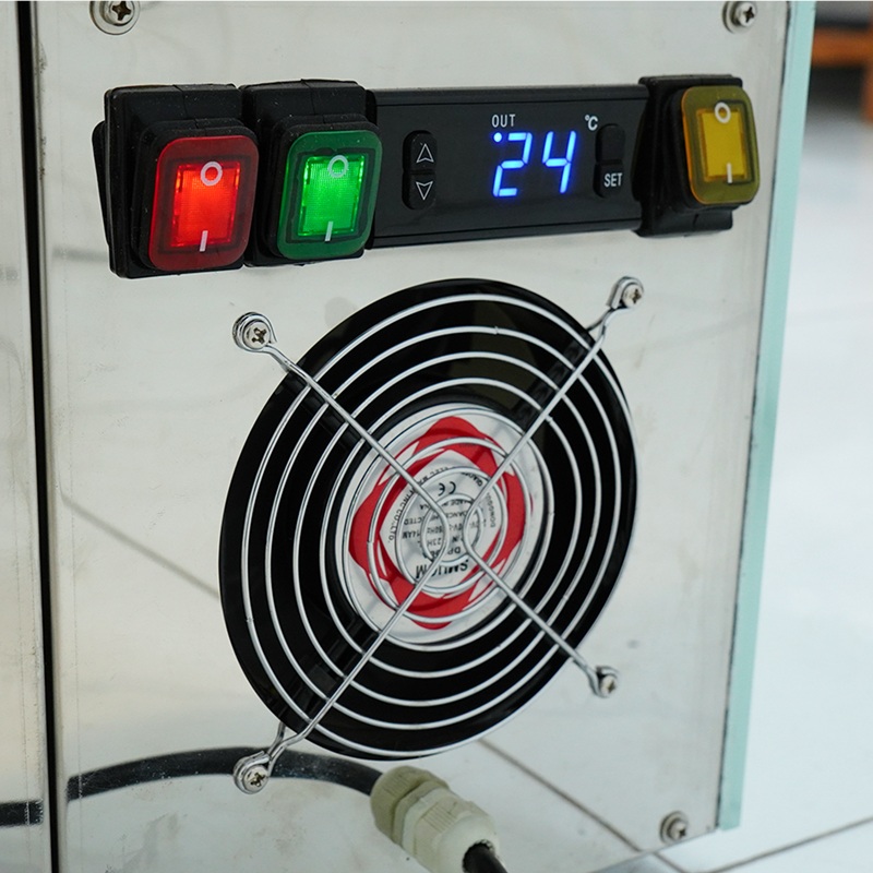 - Bước 2: Bật công tắc nguồn (màu đỏ) để khởi động tủ và bật công tắc đèn chiếu sáng (màu xanh).