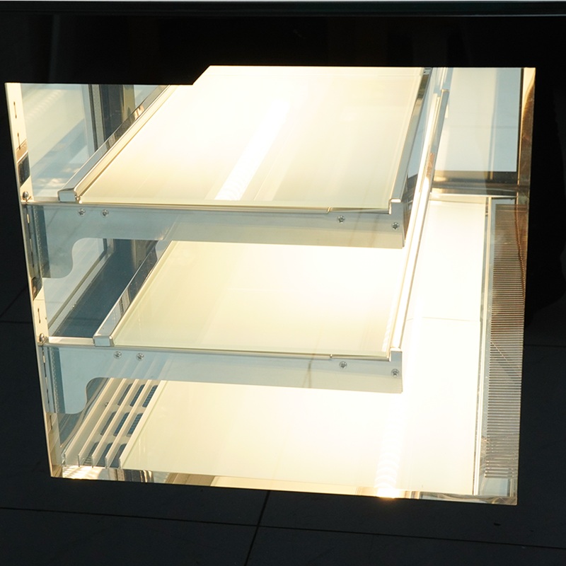 – Phần thân tủ được làm hoàn toàn từ kính cường lực 2 lớp dày 8mm, trong suốt, chắc chắn và cách nhiệt tốt. Nhờ vậy, bánh bên trong không chỉ được bảo quản an toàn mà còn hiển thị rõ ràng.