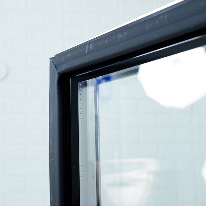 Cửa tủ làm bằng kính cường lực 2 lớp trong suốt, kết hợp hệ thống đèn chiếu sáng nội thất, giúp quan sát dễ dàng thực phẩm bên trong mà không cần mở tủ, đồng thời tăng tính thẩm mỹ và tạo cảm giác chuyên nghiệp, rộng rãi cho không gian bếp.